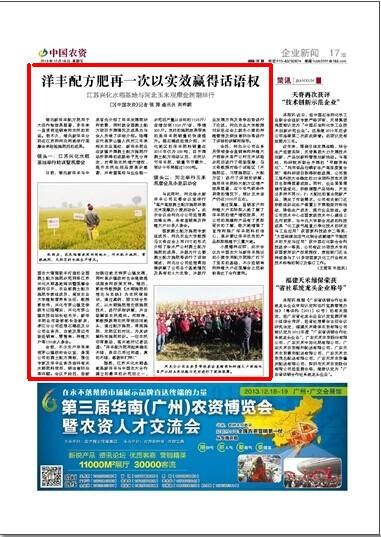 据悉,江苏兴化水稻基地是杏彩体育与中国农大合作建立的最早的示范田之一,示范田产量从当初的1120斤/亩增加到1320斤/亩,净增200斤。良好的施肥效果带来的是洋丰肥销量的快速提升。据石德成经理介绍,兴化地区的洋丰肥料销量在2010年仅为200吨,自开展测土配方活动以后,农民认可洋丰肥,销量节节攀升,预计今年将超过1000吨。
