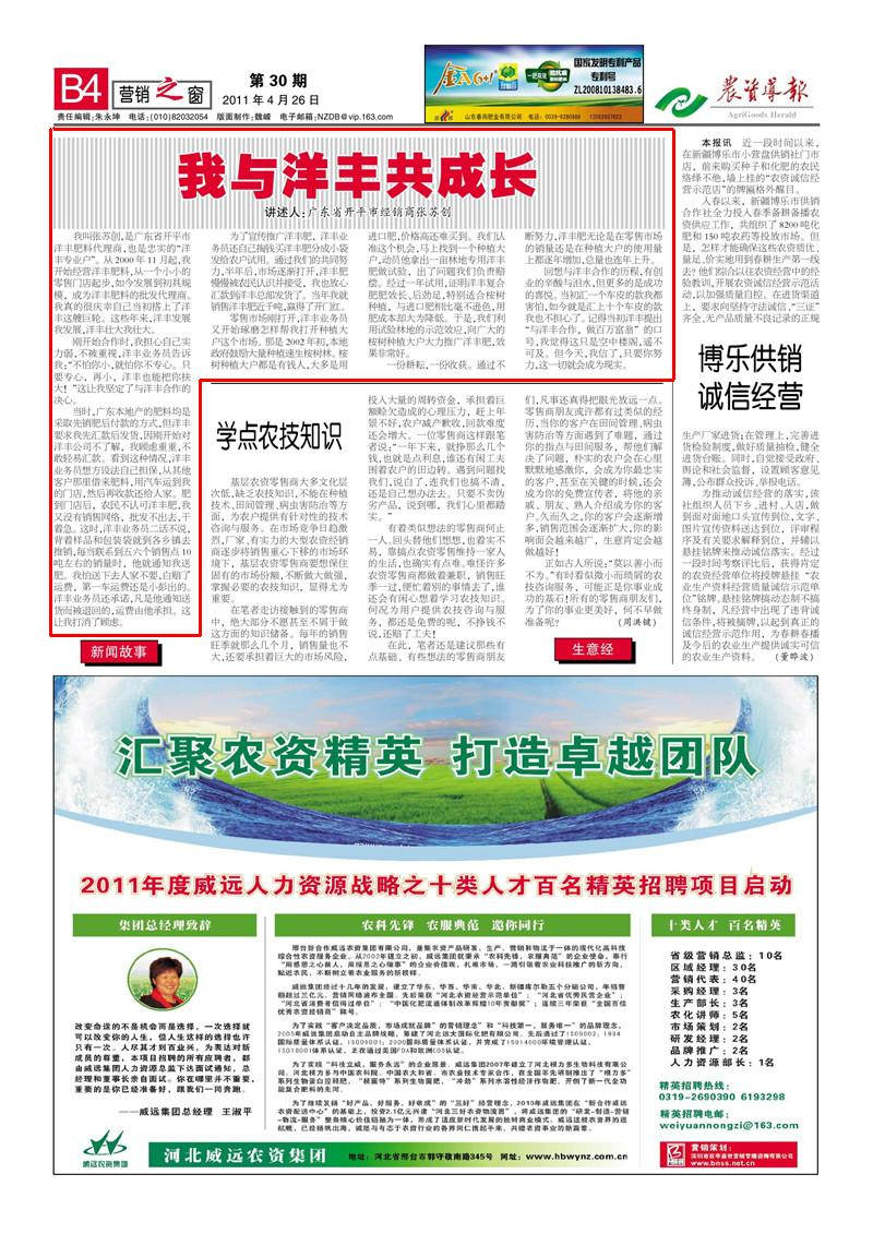 回想与洋丰合作的历程,有创业的辛酸与泪水,但更多的是成功的喜悦。当初汇一个车皮的款我都害怕,如今就是汇上十个车皮的款我也不担心了。记得当初洋丰提出“与洋丰合作,做百万富翁”的口号,我觉得这只是空中楼阁,遥不可及。但今天,我信了,只要你努力,这一切就会成为现实。