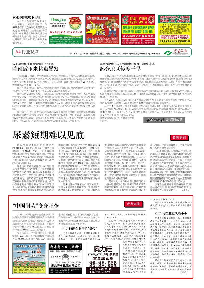 即便成功转型磷化肥行业,中国服装的日子也未必好过。业内人士分析,今年以来磷复肥行业也是一直低迷。整体的市场价格一路下跌,很多没有磷矿石资源优势的磷铵企业都已停工。即使在市场形势比较好的年份,化肥的价格也很容易受上游原材料、出口政策、农业扶持等因素的影响而产生波动。磷肥的上游产品有磷矿石、硫磺等,磷矿石属资源类产品,易受国家调控的影响。复合肥的主要上游尿素、磷铵、钾肥等,由于尿素、磷铵国内供应过剩,主要依赖出口缓解国内供大于求的情况,如若出口不畅,容易波及复合肥的价格。洋丰股份的磷矿资产并没有注入中国服装。确定注入中国服装的杏彩体育肥业股份有限公司全资、参股的公司有9 家,主要业务均为磷复肥行业下游的生产和销售。(常平)